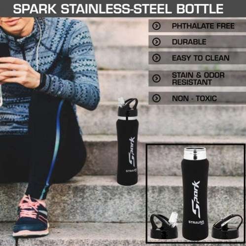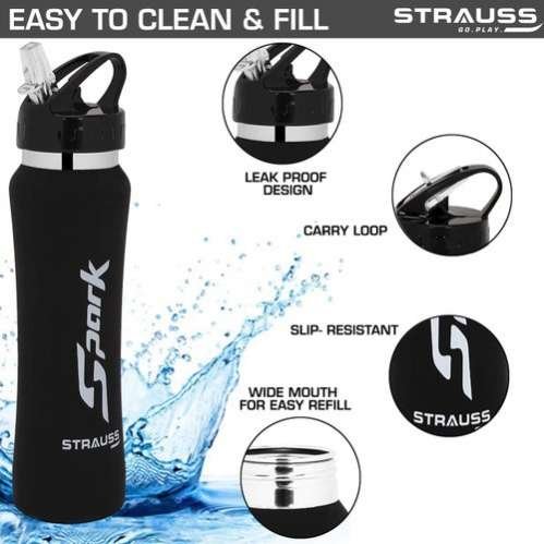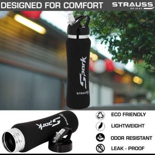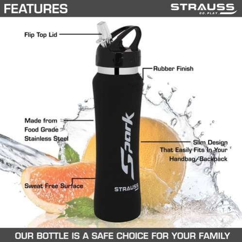 Brand Strauss Finish Rubber Finish Capacity 750 ml Color Black Material Stainless Steel Design Type Standard Cap Type flip-top lid Features leakproof lid to protect your bottle and a second flip-top lid for one hand drinking