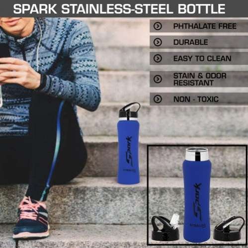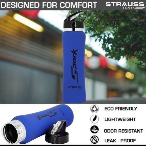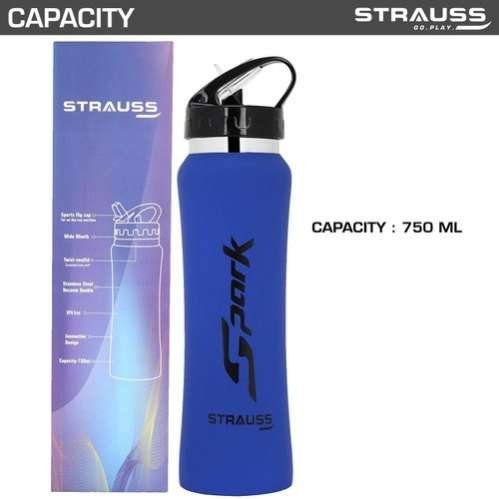 Capacity 750 ml Usage/Application Gym Brand Strauss Color Blue Material Stainless Steel Weight 250 Gram Model Name/Number Spark Finish Type Rubber Finish Features: DESIGNED FOR COMFORT - the Curve features a new, sleek design that makes holding and carrying your favorite beverages a pleasure. Includes a leakproof lid to protect your bottle and a second flip top lid for one hand drinking. The double-wall, vacuum-insulated design ensures that your hot drinks stay hot for up to 6 hours, and cold drinks stay cold for up to 24. EASY TO CLEAN & FILL: A wide-mouth opening means your Smart Flask can easily accommodate ice cubes or even fruit for a refreshing drink, and it's easier to clean as well. In-Box Contents: 1 Stainless steel Rubber finish bottle