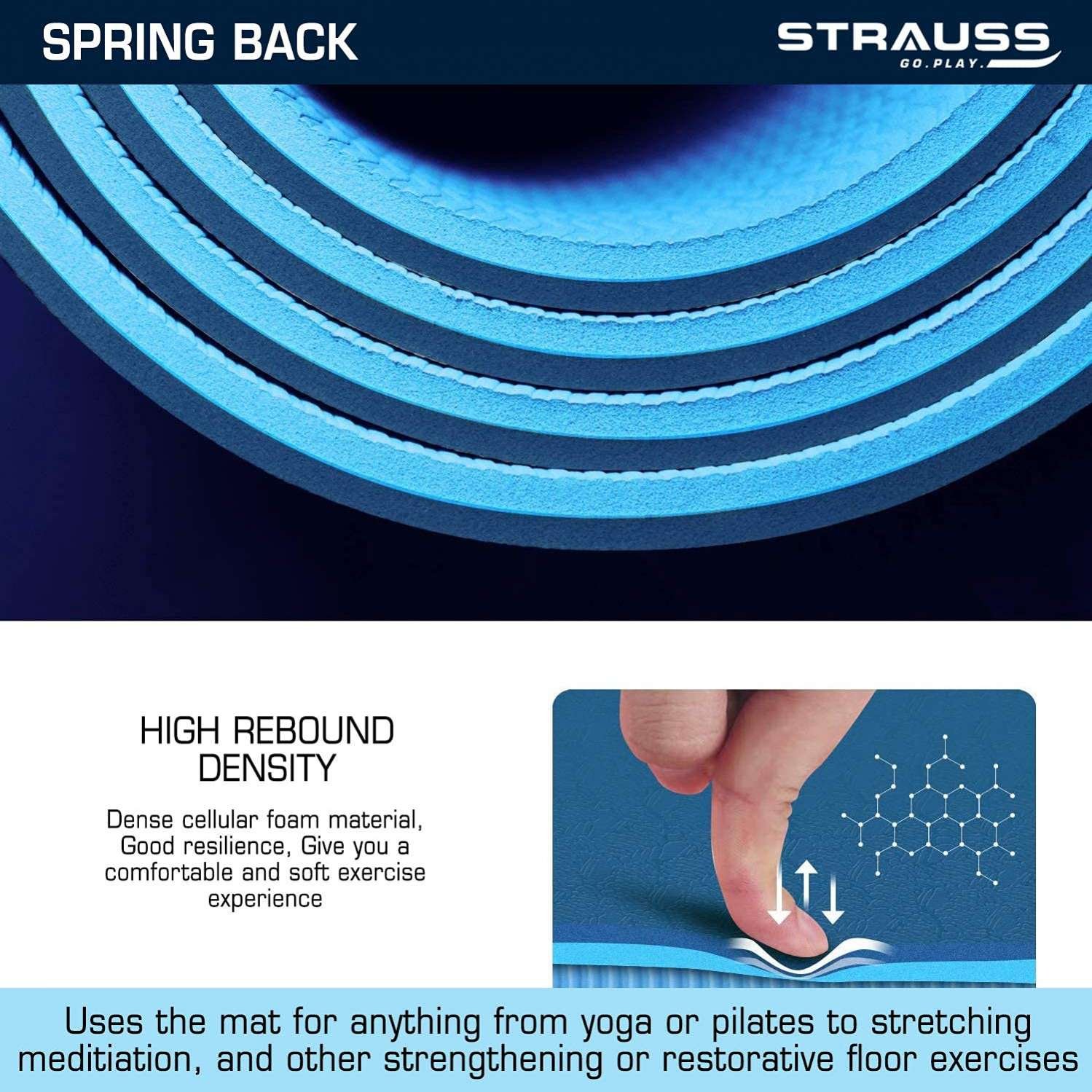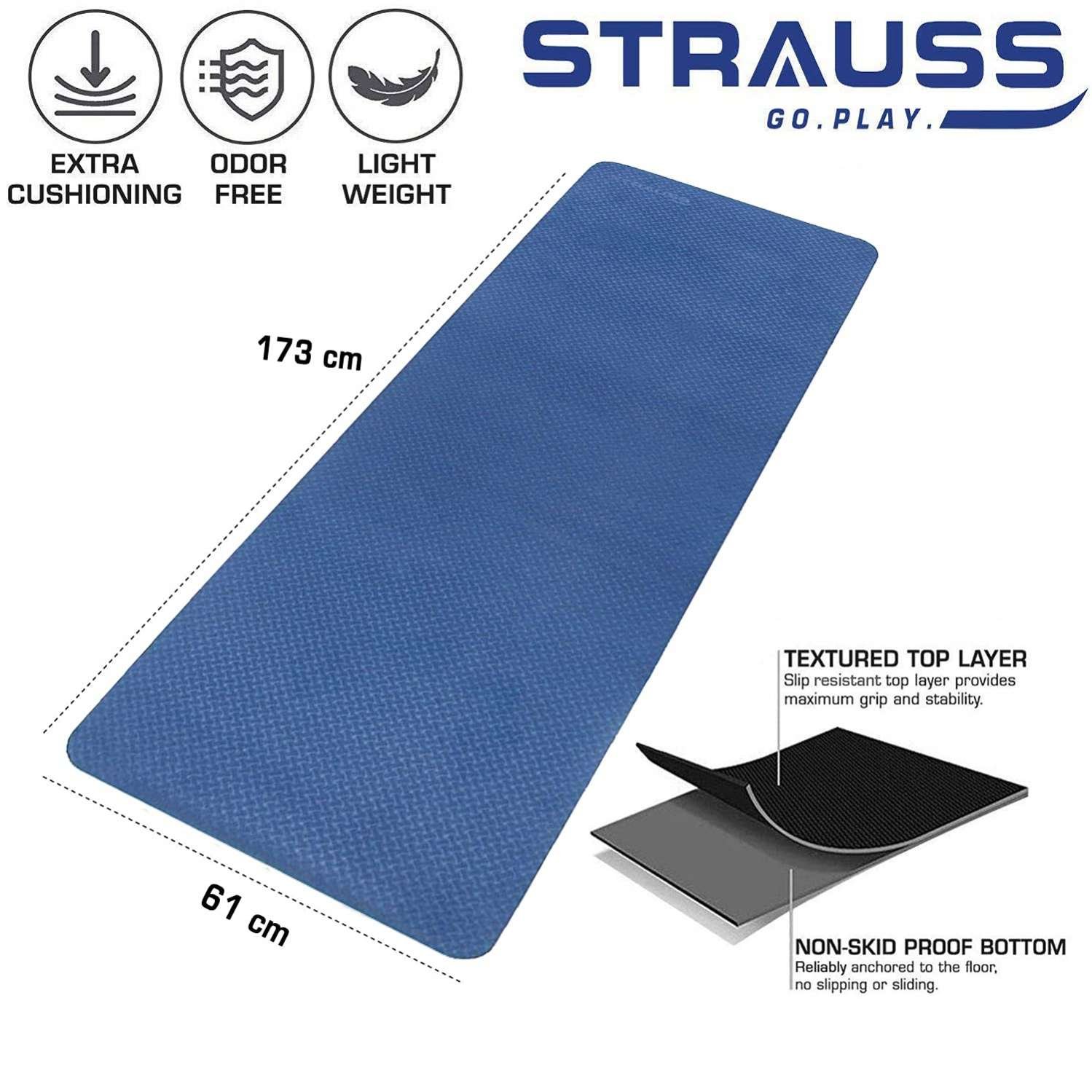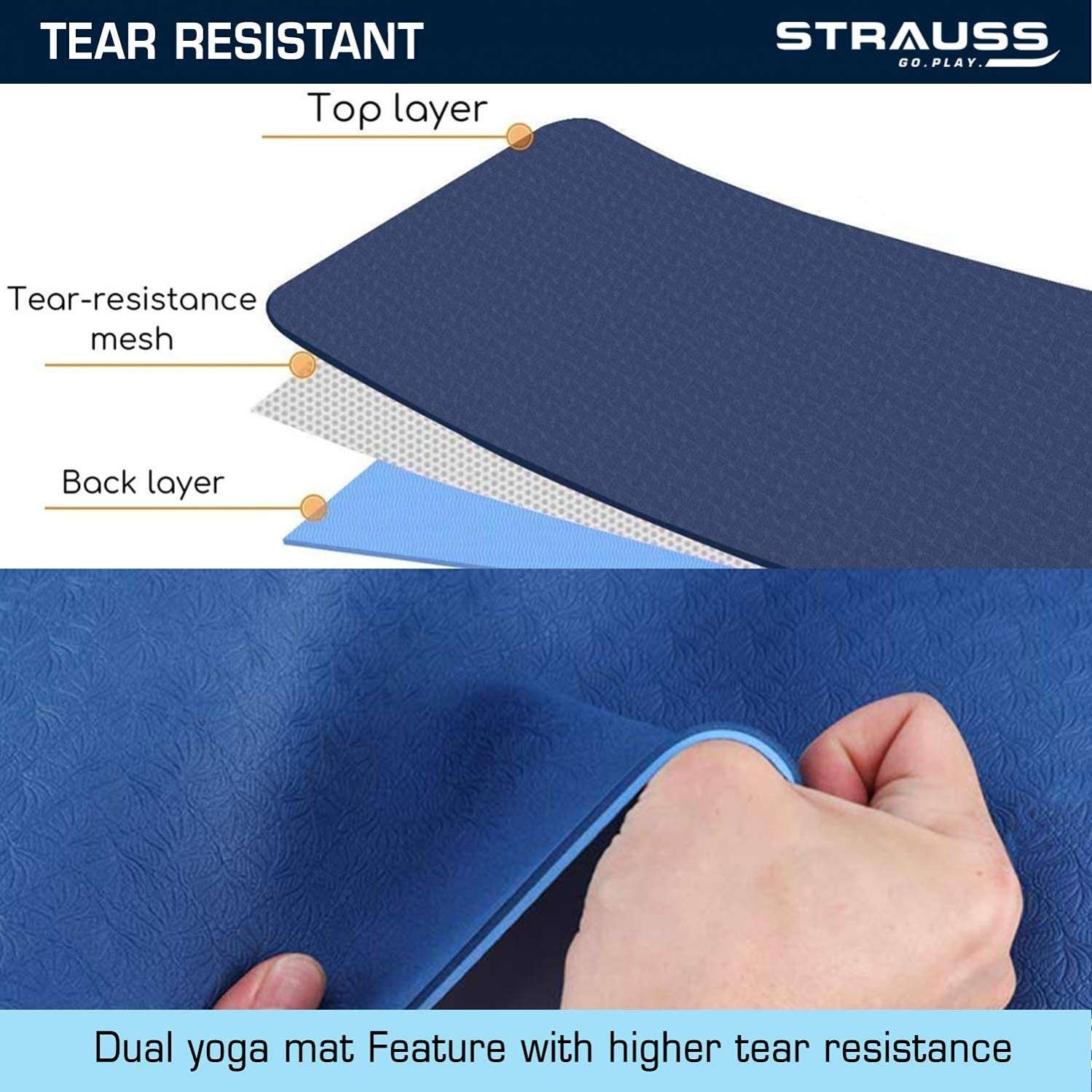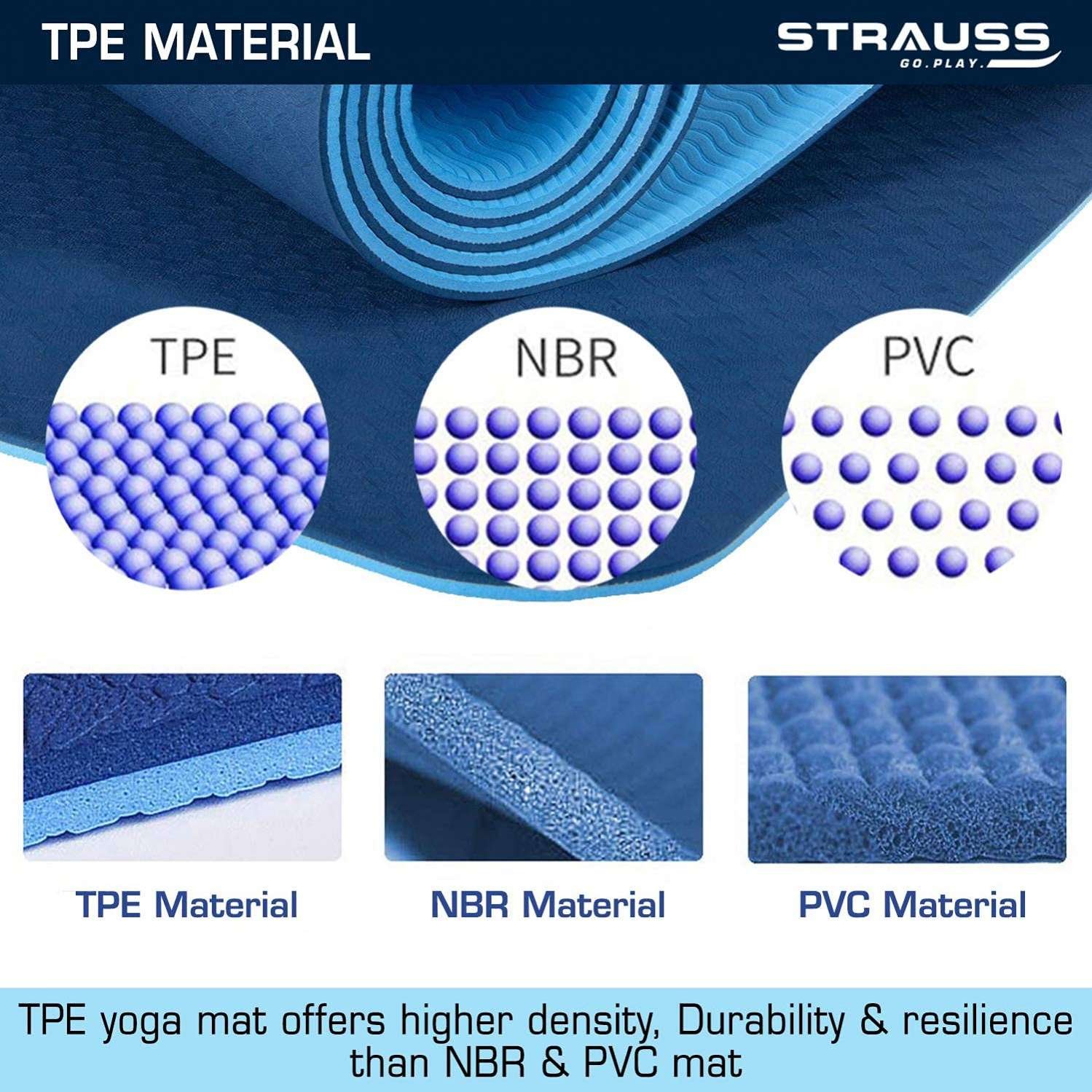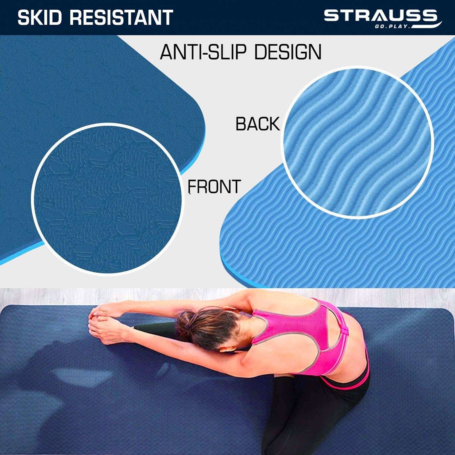 About this item PREMIUM ECO-FRIENDLY TPE MATERIAL - Most yoga mats are made of either plastic or rubber. Strauss eco-friendly TPE yoga mat moisturizes the advantages of plastic and rubber in one, which features higher elasticity, better abrasion & tear resistance, and is more eco-friendly than traditional toxic materials. DOUBLE ANTI-SLIP DESIGN - This workout Mat has double-sided non-slip surfaces. Wavy undersides make excellent traction on the floor. It unrolls pretty flat and stays put. A special textured surface prevents your hands and feet from sliding when you sweat on it. OPTIMUM THICKNESS YOGA MAT - Size: 72inch x 24inch x 1/4 inch. This 6mm fitness mat offers excellent cushioning and resilience, which is suitable for all-level Yogis. Professional alignment lines help you to focus and adjust your positions and keep the body in proper alignment. NON-SLIP TEXTURE - The bumpy non-slip texture on the surface and bottom of the yoga mat thick increases traction for stronger, giving you a firm connection to the floor, keeping you from slipping around. You can safely do any poses on the non-slip yoga mat without worrying about injury. CARE INSTRUCTIONS: Spot clean with a damp cloth with cold water and mild detergent, dry flat. Please don't expose yourself to the sun for extended periods of time. Our mats come with a free carry bag, which you can carry to the gym or anywhere you want.