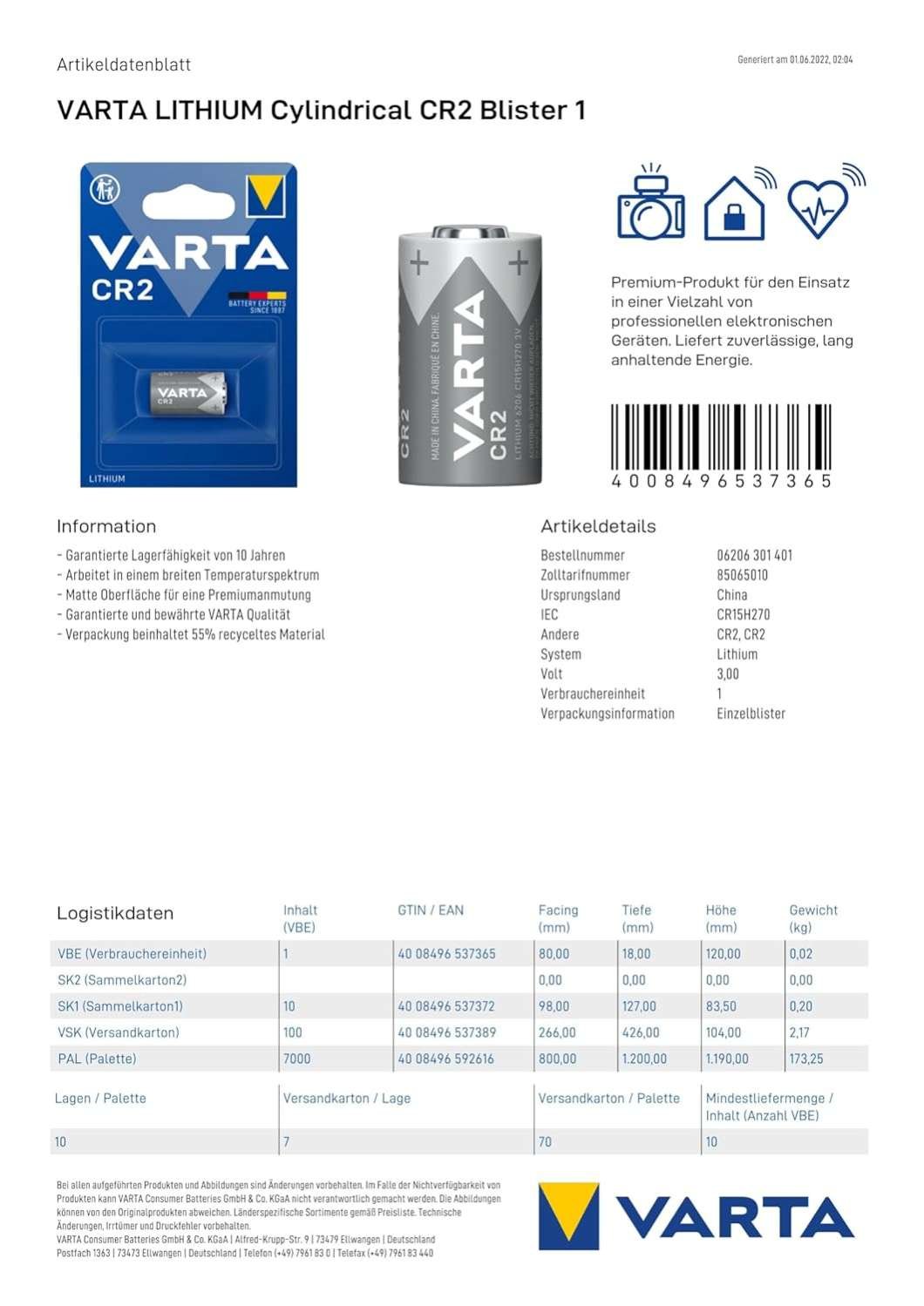 Number of Batteries 1 CR2 batteries required. (included) Brand Varta Battery Cell Composition Lithium Polymer Battery Capacity 920 Milli amp Hours Recommended Uses For Product Camera Net Quantity 1 Count Voltage 3 Re-usability Single Use Battery Weight 46 Grams Item dimensions L x W x H 16 x 83 x 121 Millimeters